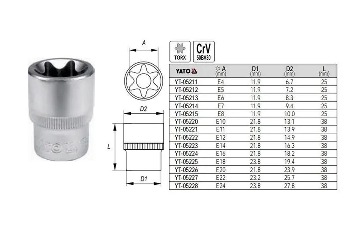Profesjonalna nasadka typu TORX (żeńska) marki YATO w rozmiarze E22, z mocowaniem na 1/2". Wykonana z wytrzymałej stali chromowo-wanadowej CrV 50BV30, co zapewnia jej wysoką trwałość i odporność na uszkodzenia. Niezbędna w każdym nowoczesnym warsztacie samochodowym.
