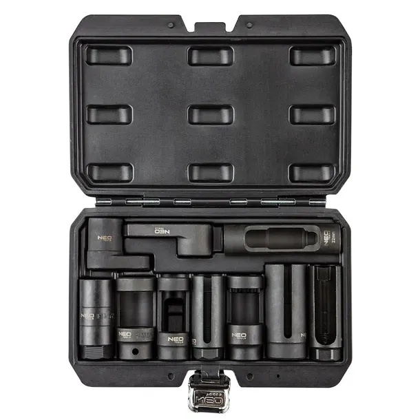 Nasadki do sondy lambda i wtryskiwaczy NEO, zestaw 10 szt. specjalistycznych nasadek umożliwiających obsługę sondy lambda i wtryskiwaczy różnych typów w samochodach popularnych marek.