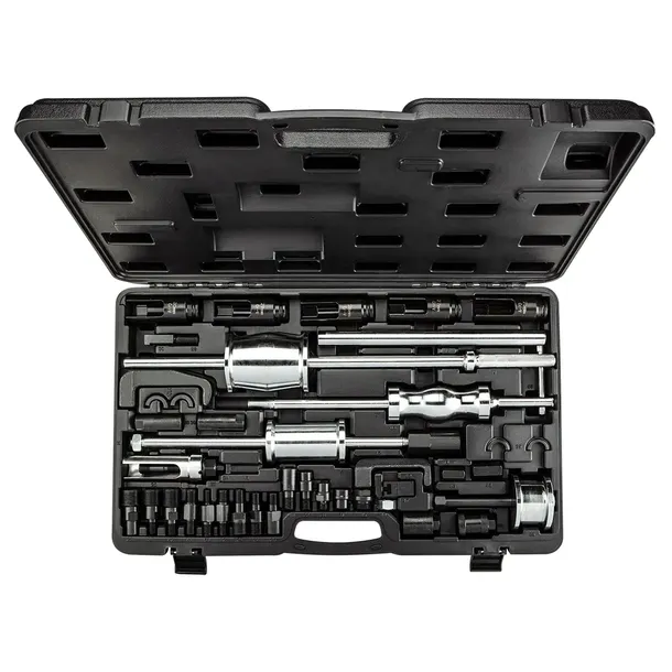 Ściągacze do wtrysków. W zestawie: młotki bezwładnościowe 1.6 kg z prowadnicą 160 mm, 2.7 kg z prowadnicą 460mm, 5.1 kg z prowadnicą 600 mm, nasadki sześciokątne z wycięciem: 25, 27, 28, 29, 30 x 100 mm, ściągacz śrubowy 35 x 29 mm z mocowaniem M17 x 1 mm, adaptery z gwintem zewnętrznym: 3 x M27 x 1 mm, 1 x M25 x 1 mm, adaptery z gwintem wewnętrznym: 3 x M27 x 1 mm, ściągacze hakowe: 13.7 x 18 x 105 mm, 12.7 x 19 x 135 mm.