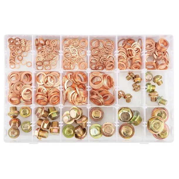 Podkładki miedziane:50 x (6x10x1 mm), 50 x (8x12x1 mm), 50 x (10x14x1 mm), 50 x (12x16x1 mm), 50 x (13x18x1 mm), 50 x (14x20x1 mm), 50 x (15x22x1 mm), 50 x (16x22x1 mm), 50 x (18x24x1 mm), 50 x (20x24.5x1 mm).Korki:5 x (M8x1), 5 x (M10x1), 5 x (M12x1.5), 5 x (G1/4), 5 x (M14x1.5), 3 x (M16x1.5), 3 x (M18x1.5), 3 x (M20x1.5)