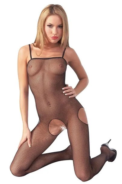 Siateczkowy kombinezon wykonany z czarnej elastycznej siateczki. Tutaj nic nie jest pozostawione wyobraźni. W kroku i na boki prowokacyjnie otwarte. Wąskie paski. Ze stopą. Produkowane bez szwu. 100% poliamid.