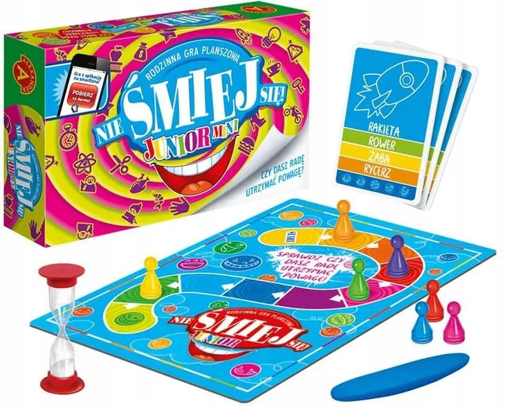 Zepsuta pralka. Jak zabrać się do jej przedstawienia? Czy pokażesz wirowanie gestami i mową ciała? A może będziesz musiał zaśpiewać opis tego hasła? Czy Twój czarujący baryton wywoła salwy śmiechu wśród zgadujących? Czy zamaszyste ruchy biodrami sprowokują chichot u rywali? Nie Śmiej Się jest towarzyską grą planszową, w której co chwila wybuchają salwy śmiechu. Kłopot w tym, że aby zdobyć przewagę nad rywalami, trzeba jak najdłużej zachować powagę.Poręczna wersja gry specjalnie stworzona dla młodszych ła, które trzeba pokazywać są łatwiejsze niż w wersji dla dorosłych oraz powiązane z tematyką zaczerpniętą z dziecięcego świata dużo postaci zwierzęcych oraz dostosowana jest również dla dzieci nie posiadających jeszcze umiejętności czytania. Jedno z haseł na karcie przedstawione jest w formie graficznej tak, żeby dzieci wiedziały co mają przedstawiać na podstawie do zabrania w podróż, na wycieczkę, czy nawet na rodzinny spacer do parku. Moc zabawy i kaskady śmiechu zawsze pod ręką. Liczba haseł: ść opakowania Plansza do gry 1 sztuka, Kolorowa kostka 1 sztuka, Karty haseł 55 sztuk, Pionki 8 sztuk, Klepsydra 1 sztuka, Kamień celtycki 1 sztuka, Nos Klauna 1 sztuka, graczy: 3-8 os