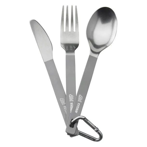 Sztućce wykonane z tytanu, dzięki czemu cechują się bardzo niską wagą. Zestaw zawiera łyżkę, widelec oraz nóż. Do zestawu dołączony jest praktyczny karabinek oraz etui. Cały zestaw waży zaledwie 39 g.