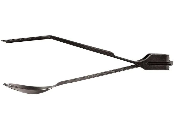 Multitool łączący wszystkie elementy podczas przenoszenia, umożliwia również zbudowanie ze sporka i łopatki szczypiec do nakładania potraw.