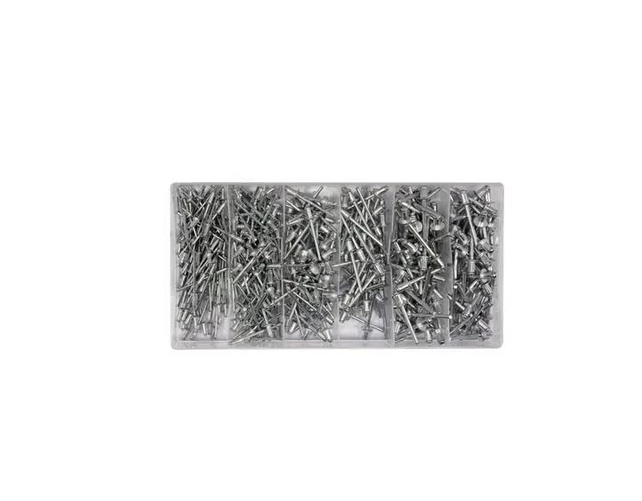 Praktyczny zestaw 400 sztuk aluminiowych nitów zrywalnych z trzpieniem stalowym. Zawiera cztery najpopularniejsze rozmiary od 2,4 mm do 4,8 mm. Całość umieszczona w wygodnym opakowaniu typu "sortownik", który ułatwia przechowywanie i szybki dostęp do odpowiedniego rozmiaru.