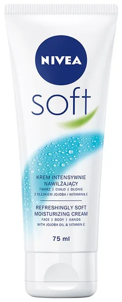 Intensywnie nawilżający krem NIVEA Soft zawiera teraz ulepszoną formułę, która zapewnia jeszcze intensywniejsze nawilżanie i pielęgnację. Krem ten ma niezwykle lekką konsystencję, dzięki czemu błyskawicznie się wchłania, pozostawiając wyjątkowe uczucie gładkości, miękkości i ożywienia. W jego skład wchodzi olejek jojoba, który intensywnie nawilża skórę, a także witamina E chroniąca jej naturalną strukturę. Idealnie nadaje się do codziennej pielęgnacji – jest odpowiedni do wszystkich rodzajów skóry.