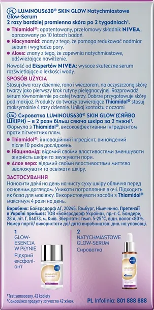Głęboko nawilża skórę. 99% potwierdza: promienna skóra po 2 tygodniach. Innowacyjna formuła z Thiamidolem®, opatentowanym, przełomowym składnikiem NIVEA, opracowanym po 10 latach badań. Formuła wzbogacona jest również o Niacynamid i Aloes.