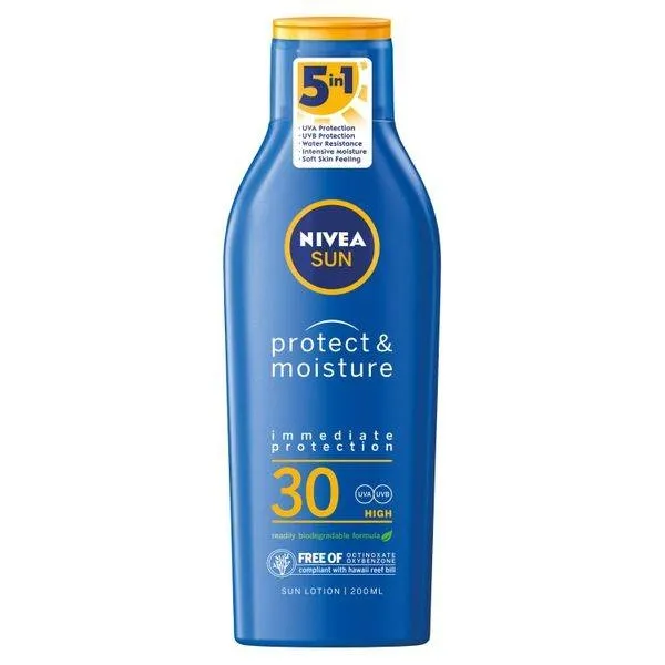 Nivea Sun Protect&Moisture balsam do opalania SPF30 bardzo szybko zapewnia ochronę przed szkodliwym działaniem promieni UV, dodatkowo pozostawiając skórę nawilżoną, bez białych plam.