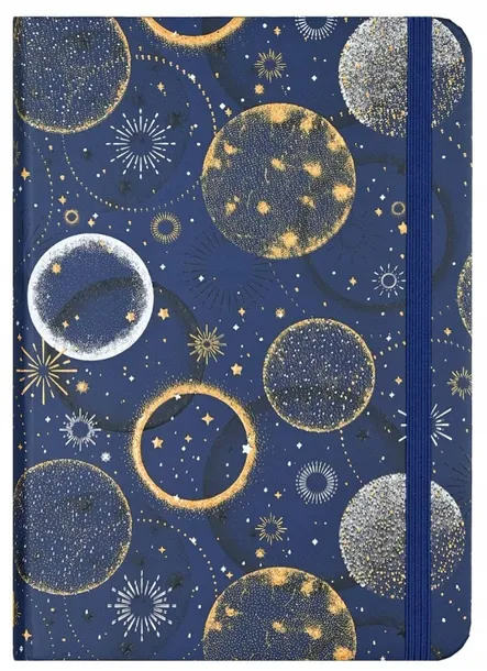 Mały notatnik firmy Peter Pauper Press - Kosmos (Cosmos).Każdy notes marki Peter Pauper Press jest wyjątkowym dziełem sztuki. Bogactwo motywów i kolorów sprawia, że każdy znajdzie wzór idealnie dopasowany do osoby i okazji. Okładka utrzymana w ciemnoniebieskiej kolorystyce przedstawia srebrene i złote planety i gwiazdy. Notatnik posiada tłoczenia i elementy pokryte złotą i srebrną folią, złote brzegi stron oraz dopasowane kolorystycznie zamknięcie na gumkę.Szczegóły:- okładka sztywna, wytłaczana, zdobiona złotą i srebrną folią- złocone brzegi stron,- notes jest zszywany, a po otwarciu leży płasko - ułatwia to pisanie- zamknięcie na gumkę- operta na luźne notatki, wizytówki, itp.- kartki wykonane z wysokiej jakości papieru bezkwasowego - niezwykle trwałe, z cechami gwarantującymi długi czas użytkowania- gramatura 120 gsm- zadruk w jasnoszare linie, dwustronny, na lekko kremowym papierze- wymiary: 12,7 cm x 17,8 cm - format zbliżony do B6- ilość stron: 160