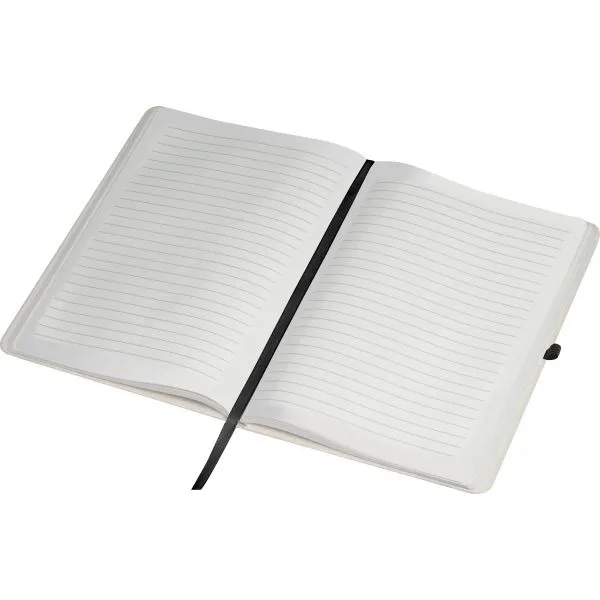 Notes o formacie A5, wykonany z kartonu po mleku pochodzącego z recyklingu, posiada 160 stron w linię, zamknięcie na gumkę, materiałową zakładkę oraz pętelkę na długopis.