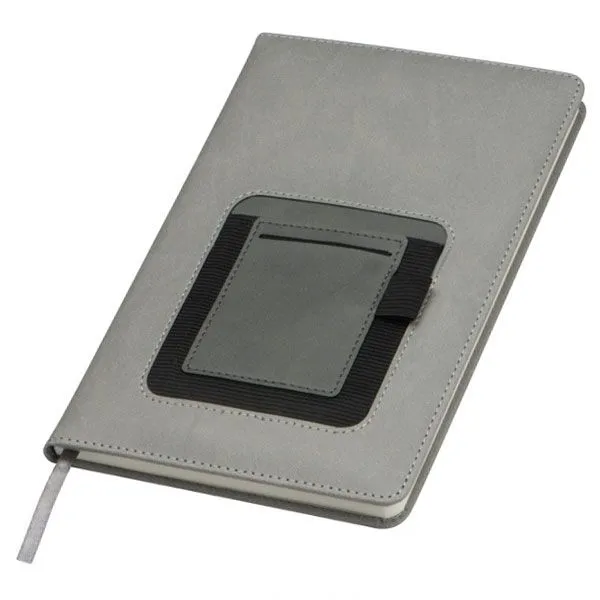 Elegancki notes o formacie A5 ze 160 kartkami w kropki, zakładką oraz pętelką na długopis. Na okładce znajduje się kieszonka na telefon.