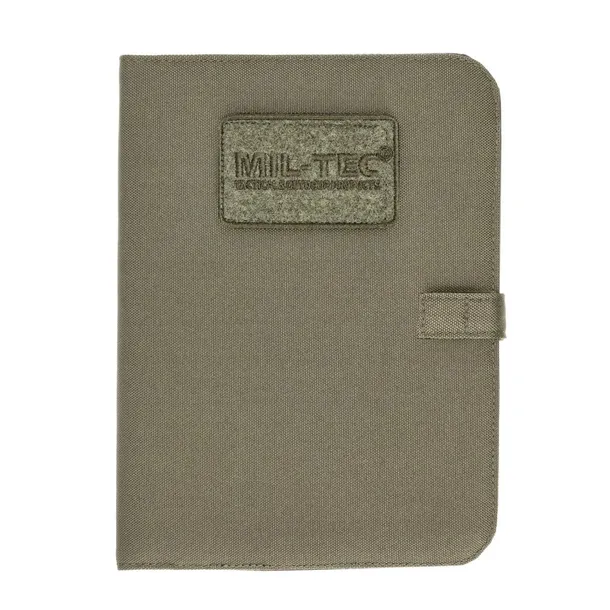 Wewnątrz umieszczono wymienny notes, cztery przegrody na dodatkowe dokumenty oraz dwa elastyczne uchwyty przeznaczone na długopisy lub niewielkie latarki. Całość zamykana jest solidnym rzepem, który zapobiega przypadkowemu otwarciu. Na przedniej stronie notatnika umieszczono naszywkę velcro z logo marki Mil-Tec. Naszywkę można usunąć i zastąpić własną.