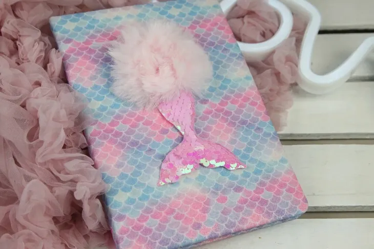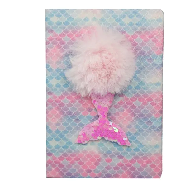 Piękny mieniący notes syrenka. Po środku znajduje się mięciutki różowy puszek. Pod puszkiem różowy, cekinowy ogon. Kartki w paski w dwóch kolorach: niebieskim oraz różowym.