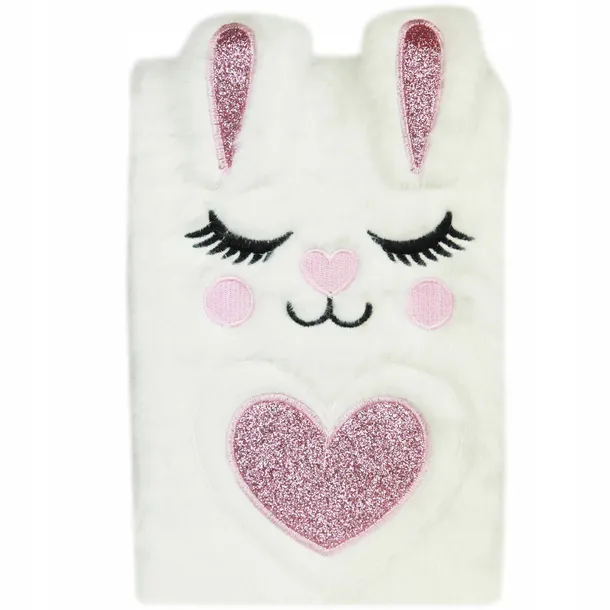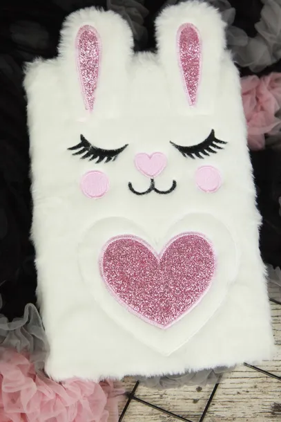 Okładka notesu jest pokryta mięciutkim futerkiem, na której znajduje się słodki króliczek. Posiada brokatowe serduszko oraz uszka 3D, które pięknie się mienią.