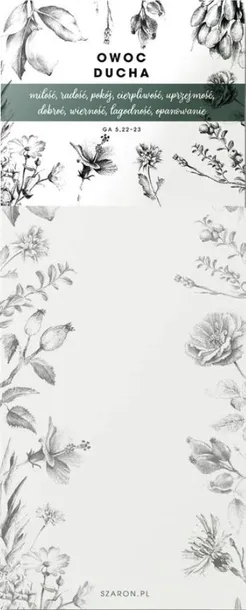 Notes ozdobiony jest delikatnym biało-czarnym wzorem przedstawiającym owoce i rośliny, co nadaje mu elegancki i stylowy wygląd. Znajduje się na nim werset z Listu do Galacjan 5:22-23: Owocem zaś Ducha jest: miłość, radość, pokój, cierpliwość, uprzejmość, dobroć, wierność, łagodność, opanowanie.