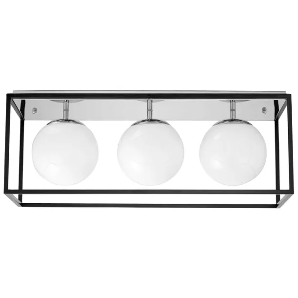 ✨ Nadaj wnętrzu nowoczesną elegancję i wyrazisty charakter dzięki stylowej lampie sufitowej o geometrycznej formie. Prostokątna, metalowa rama w czarnym wykończeniu została uzupełniona trzema mlecznymi, kulistymi kloszami oraz subtelnymi, złotymi detalami, które nadają całości luksusowego i dopracowanego wyglądu.