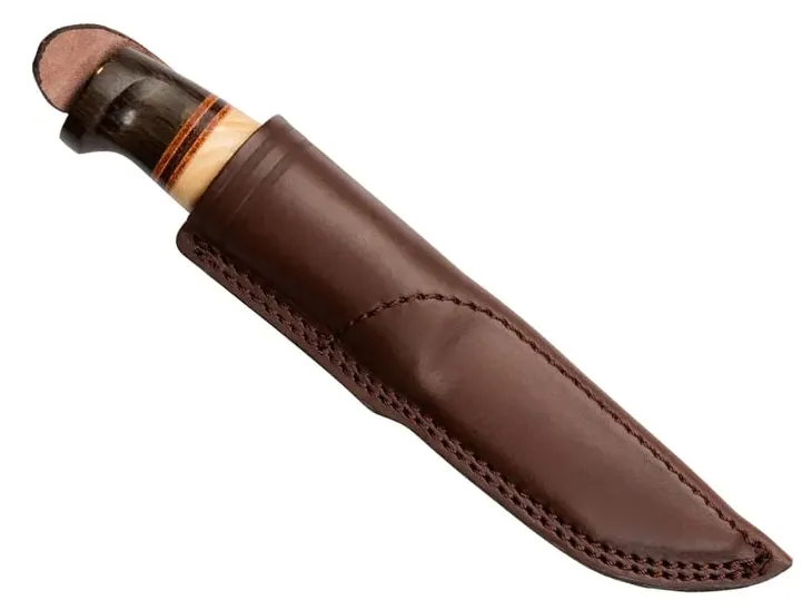 Klinga z 3-warstwowej nierdzewnej stali, rękojeść z palisandru, skóry i z mazerowanej brzozy. Skórzana pochwa. Design by Erling Opstad, 1986 r.