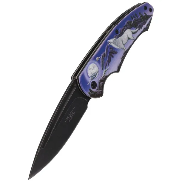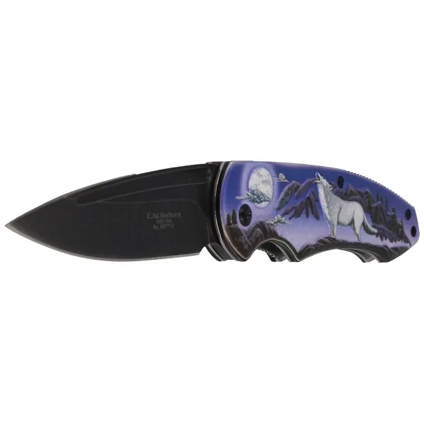 Nóż składany marki Herbertz Solingen z okładzinami z aluminium pokrytymi nadrukiem 3D z motywem wilka. Sceną wilka wyjącego do księżyca podczas pełni. Piękno foldera podkreśla matowo wykończone ostrze, metodą Stonewashed.