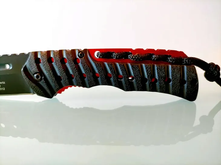 Pewny i bezpieczny chwyt zapewnia ergonomiczna rękojeść pokryta teksturowanymi okładzinami. Ponadto przez grzbiet rękojeści przeciągnięta jest linka paracord. W tylnej części rękojeści znajduje się metalowy klips.