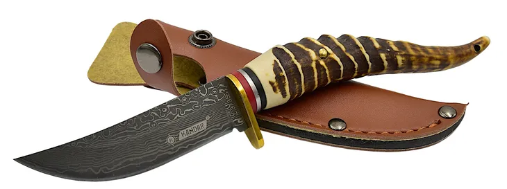 W zestawie otrzymamy piękny nóż oraz bardzo praktyczną, wykonaną ze skóry naturalnej pochwę, która jest starannie dopasowana do noża i dodatkowo zapinana metalowym zatrzaskiem co uniemożliwia przypadkowe wysunięcie się z niej noża. Pochwa dodatkowo posiada szlufkę, dzięki której możemy zamocować ją przy pasku.