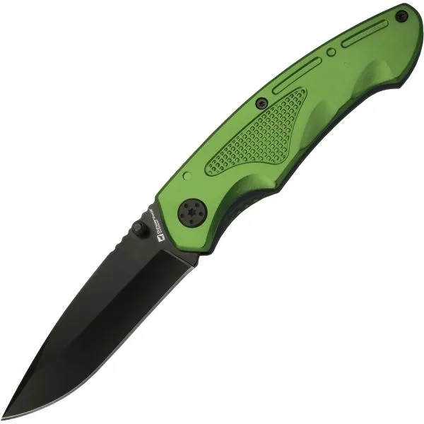 Nóż kieszonkowy wykonany ze stali nierdzewnej z aluminiową rękojeścią i klipsem do mocowania na pasku.