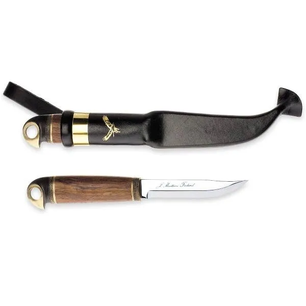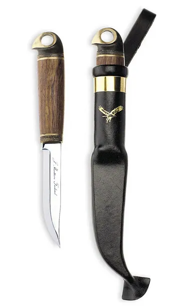 Specjalny nóż Eagle Knife, to jeden z najbardziej wyjątkowych i popularnych noży w ofercie Marttiini. Nóż o wysokim kunszcie wykonania, zaliczany jest do najpopularniejszych noży specjalnych-prezentowych. Ostrze ze stali nierdzewnej, jest bardzo ostre i twarde, a przy końcu jest lekko zadarte w górę. Rękojeść została poddana obróbce cieplnej, stąd ciemny kolor drewna kręconej brzozy, która została dodatkowo zawoskowana. Trzonek zakończony jest głowicą - odlewaną z brązu głową ptaka. Jelec również został wykonany z brązu. Czarna skórzana pochwa zdobiona jest niewielkim złotym nadrukiem z orłem. Dodatkowo rowek ostrza przy łączeniu z rękojeścią, zapewnia płynne wykrawanie mięsa ze zwierzyny, bez zasysania i blokowania noża. Jest to nóż o cechach tradycyjnego noża myśliwskiego Eagle Knife, doskonale nadaje się na prezent.
