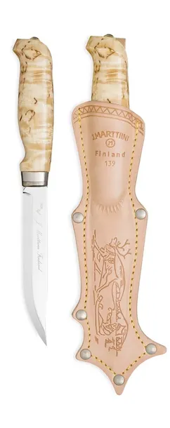 MARTTIINI LYNX 139 to standardowych rozmiarów ekstrawagancki nóż o nowoczesnym profilu kręconej brzozowej rękojeści. Ostrze ze chromowanej stali nierdzewnej zapewnia ostrość oraz zabezpiecza przed korozją, świetnie sprawdzając się przy pracach codziennych. Nóż zaprojektowano z myślą o kempingu i myślistwie, opatrując go precyzyjnie wyważoną, solidną rękojeścią o profilowaniu na dłoń - tak, aby zapewnić bezpieczeństwo również podczas trudniejszych wyzwań. Idealnie sprawdzi się przy krojeniu suszonego, solonego mięsa czy precyzyjnego cięcia w drewnie. Zwieńczenie konstrukcji stanowi stal przy klindze.