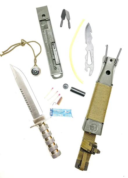 - Mini zestaw survivalowy umieszczony w szczelnym pojemniku, chowany w rękojeści.