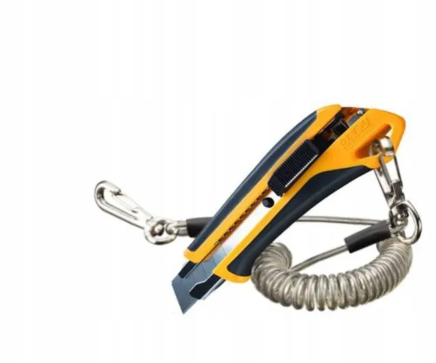 Przypięta linka nie przeszkadza w pracy ani też w wymianie ostrza, otwór pozwala na wygodne powieszenie noża na ścianie czy też na tablicy z narzędziami.