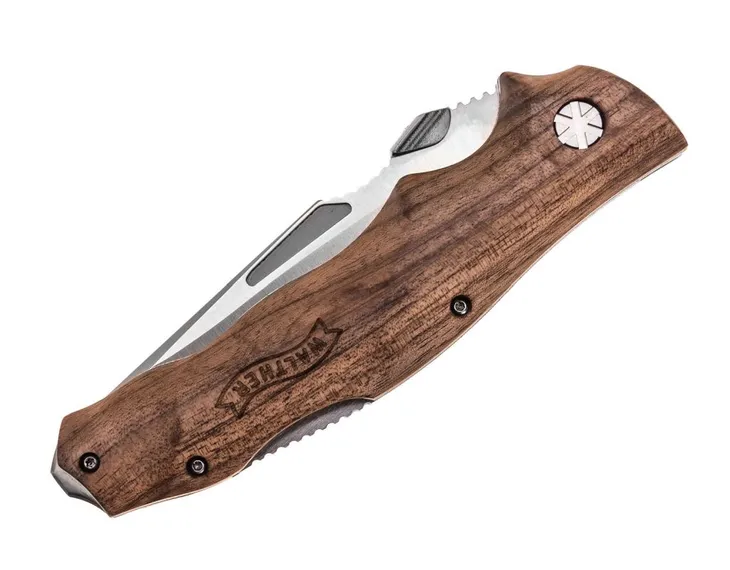 Nóż ma eleganckie okładziny z drewna orzecha włoskiego o matowym wykończeniu. Okładki mają profilowany kształt, z wyraźnym wycięciem na palec, co skutecznie poprawia chwyt noża i komfort jego użytkowania. W pozycji otwartej głownia blokowana jest za pomocą blokady back lock.