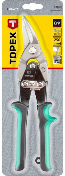 ✔️ Nożyce do blachy prawe TOPEX (nr ref. 01A426) o długości 250 mm służą do przecinania blachy o grubości do 1,2 mm. Głowica wykonana ze stali chromowo-wanadowej. Wygodny uchwyt dwumateriałowy jest doskonale wyprofilowany, dzięki czemu nożyce rewelacyjnie układają się w dłoni. Ostre krawędzie szczęk lekko i płynnie przecinają blachę. Marka TOPEX skierowana jest do majsterkowiczów.