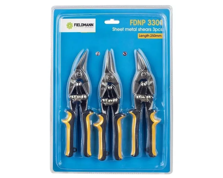 Zestaw nożyc do blachy Fieldmann FDNP3301 zawiera nożyce do cięcia po prawej, lewej i prostej stronie arkuszy i twardych materiałów, rur, metali i innych podobnych materiałów. Masywne i ergonomicznie ukształtowane uchwyty zapewniają wygodny chwyt, dzięki czemu korzystanie z nich będzie w pełni komfortowe.