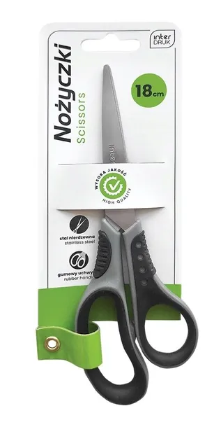 Poręczne nożyczki o długości 18 cm. Precyzyjne ostrze wykonane ze stali nierdzewnej. Gumowy uchwyt zapewnia komfort użytkowania.