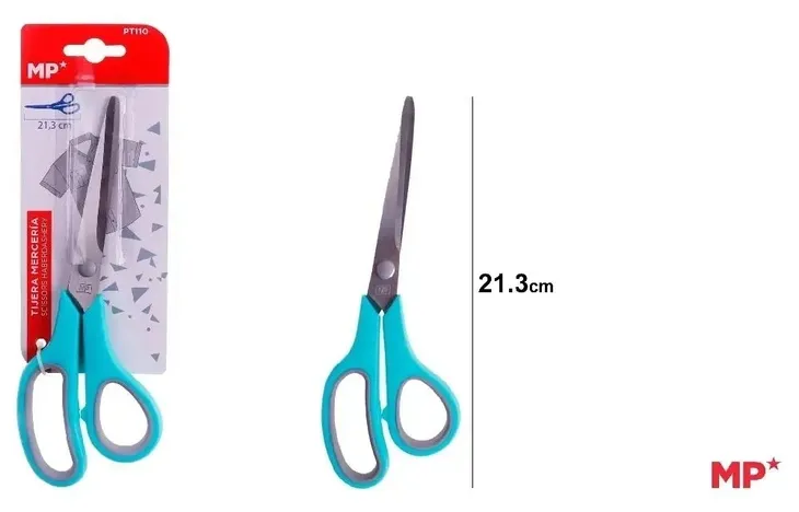 Nożyczki z termoplastyczną rękojeścią i miękką gumą dla lepszego chwytu. Ostrza ze stali nierdzewnej. Zaokrąglone końcówki zapobiegające przebiciom. Jedno z ostrzy jest szlifowane dłutem dla zapewnienia dokładności. Idealny do cięcia tkanin. Długość: 21 cm.