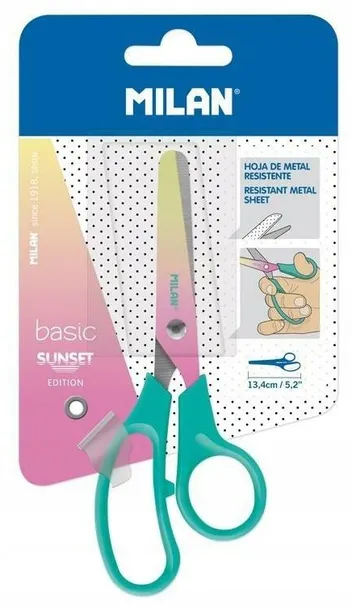 Opakowanie życzki szkolne BASIC SUNSET z kolorowym ostrzem i plastikową zieloną rączką. Długość 13,3 cm. Ostrze ze stali nierdzewnej z zaokrągloną końcówką. Idealne do użytku szkolnego. Oryginalny produkt stworzony przez własny dział badawczo-rozwojowy MILAN. Rozmiar nożyczek: 13,3 x 5,3 x 1,1 cm.