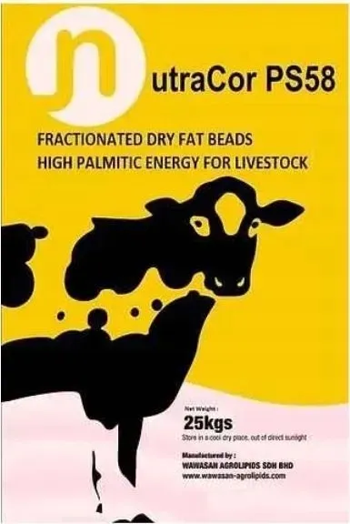 • PS58 to suchy tłuszcz paszowy wytwarzany ze świeżo wyprodukowanych frakcji oleju palmowego (100% pochodzenia roślinnego).• Stanowi źródło energii zarówno dla przeżuwaczy, jak i dla zwierząt monogastrycznych. Produkt charakteryzuje się wysoką zawartością kwasu palmitynowego C16:0, zwiększającego zawartość tłuszczu w mleku u wysoko wydajnych krów mlecznych.• Trójglicerydy o wysokiej temperaturze topnienia są efektywnymi składnikami energetycznymi w dawce pokarmowej dla krowy mlecznej• Bezzapachowy charakter NutraCor PS58 nie zniechęca krów do pobierania suchej masy.• PS58 jest równie odpowiednim źródłem energii dla bydła mięsnego.• Zawarte w nim kwasy tłuszczowe o wysokiej temperaturze topnienia pomagają poprawić jakość tuszy przy większej jędrności, co prowadzi do wydłużenia okresu przydatności do spożycia.Opakowanie: 25kg