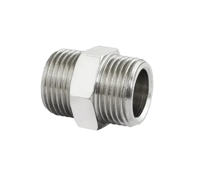 Łącznik - nypel wykonany z mosiądzu niklowanego.