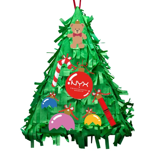 Home Alone - Pull-to-Open Surprise Makeup Box marki NYX Professional Makeup. Zestaw prezentowy. Pochodzi ze świątecznej kolekcji 2024, zainspirowanej światowym, filmowym bestsellerem pt. "Kevin sam w domu", który na trwałe wpisał się w bożonarodzeniowe tradycje wielu państw. Posiada formę choinkowej piniaty. Wystarczy tylko jedno pociągnięcie za kolorowe sznureczki by otworzyć słodką makijażową niespodziankę, jak za dziecięcych czasów. Piniata posiada specjalne sznureczki, dzięki czemu można ją powiesić w wybranym miejscu np. przy choince. W skład zestawu wchodzi aż 12 bestsellerowych kosmetyków do makijażu twarzy, oczu i ust. Zestaw został umieszczony w kartonowym opakowaniu z klimatycznym świątecznym nadrukiem.