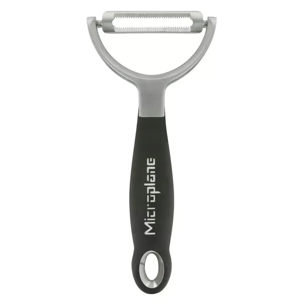 Obieraczka do warzyw i owoców marki Microplane to doskonały wybór dla każdego kucharza, zarówno profesjonalisty, jak i amatora, który ceni sobie wygodę i efektywność podczas przygotowywania posiłków. Dzięki wyjątkowo ostrym podwójnie ząbkowanym ostrzom ze stali nierdzewnej obieranie staje się łatwe i płynne. Idealna do owoców i warzyw, zwłaszcza tych o delikatniejszej skórce, jak pomidory, kiwi, mango itp. Ergonomiczny uchwyt „soft touch” z otworem do zawieszenia zapewnia komfortowy chwyt, co ułatwia obieranie bez zmęczenia dłoni, nawet przy dłuższym użytkowaniu.