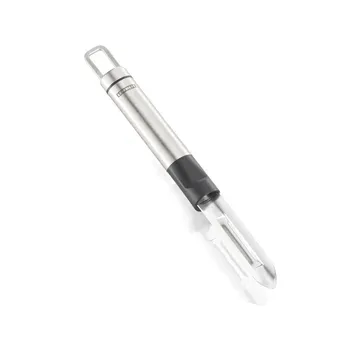 Solidne wykonanie, komfortowe użytkowanie i niezawodne ostrze to cechy obieraczki prostej marki Leifheit. Została ona wykonana z gustownej stali szlachetnej, do której dodano elementy z wytrzymałego, czarnego tworzywa sztucznego. Zaokrąglony uchwyt świetnie leży w dłoni, nie ślizga się i nie męczy jej nawet podczas dłuższej pracy. Nóż tego modelu jest ostry i trwały, precyzyjnie usuwa skórę z warzyw i owoców, a swoje właściwości zachowuje nawet po wieloletnim użytkowaniu. Obieraczka świetnie sprawdzi się zarówno w kuchni amatora, jak i profesjonalisty.Z obieraczką prostą marki Leifheit efektywnie i szybko obierzemy warzywa, które wkomponujemy w przygotowane dania. Model ten nadaje się także do obierania owoców, a dzięki wyprofilowanej i wyostrzonej końcówce, również do usuwania „oczek” z ziemniaków i innych niedoskonałości. Uchwyt obieraczki wyposażono w zaczep umożliwiający zawieszenie jej na haczyku i wygodne przechowywanie. Jej całkowita długość to 23,5 cm. Łatwo utrzymać ją w czystości. Jest objęta 3-letnią gwarancją.