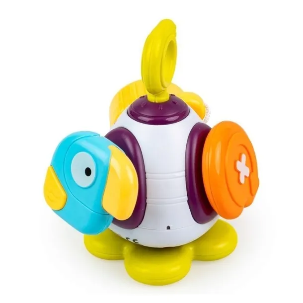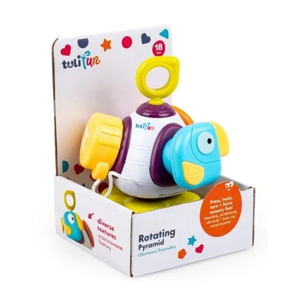 Praktyczna zabawka w kompaktowym rozmiarze zapewni maluchowi zręcznościową rozrywkę, niezależnie od miejsca, w którym się znajduje. Na każdej ze ścianek piramidki kryje się inne zadanie do wykonania: obrotowy element, piszczący ptaszek do naciskania, wtyczka do dopasowania w otwory i wciskania, a także terkoczący element do przekręcania. Po ustawieniu piramidki na kwiatku, zdobiącym jedną ze ścianek, można nią kręcić za pomocą paluszka.