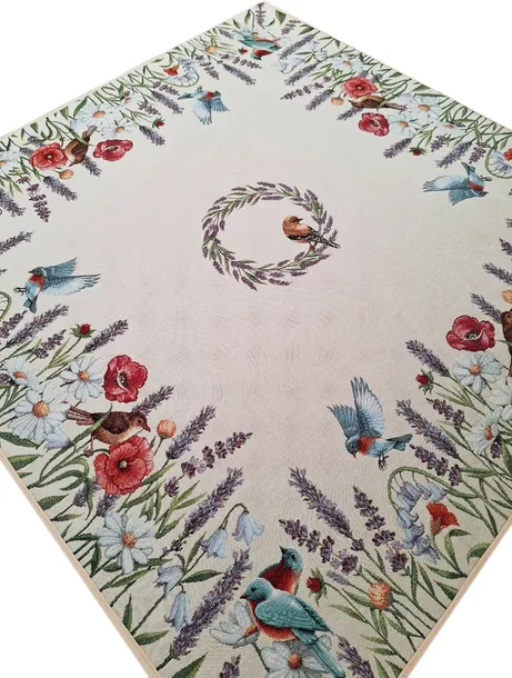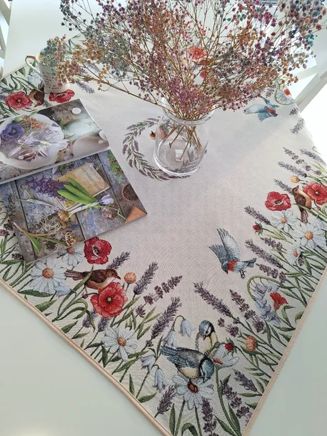 Zanuć letnim wiatrem polnych kwiatów z naszym pięknym obrusem! Ten uroczy dodatek wnętrzarski ozdobi Twoją przestrzeń subtelnym urokiem natury. Na jasnym tle rozkwita paleta kolorowych kwiatów, od maki, przez stokrotki po lawendę, tworząc malowniczy pejzaż przyrody. W centrum uwagi znajduje się delikatny wianek z lawendy, dodając wnętrzu jeszcze więcej sielskiego uroku. Całość dopełniają radosne ptaszki fruwające wokół, dodając nuty życia i radości. Ten obrus nie tylko ozdobi Twoje wnętrze, ale także doda mu świeżości i naturalnego piękna, sprawiając, że każda chwila spędzona przy stole stanie się jeszcze bardziej wyjątkowa.Wykonany z tkaniny hiszpańskiej żakardu gobelinowego, w skład której wchodzi 75% poliestru, 22% bawełny i 3% poliakrylu.Materiał ma gramaturę 420g/m2, pilling 4, odporność na światło 4.Wymiary: 100x100 cm (+/-5%)Tkanina jest wysokiej jakości - solidna i gruba.Produkt gobelinowy, tkany, nie jest to żaden nadruk czy naszywka.