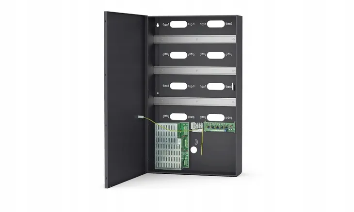 Obudowa wyposażona jest w trzy szyny DIN, zasilacz buforowy 13,8 V/10 A, łącznik antysabotażowy oraz bezpiecznikowy rozłącznik zasilania. Dostęp do wnętrza obudowy jest chroniony przez drzwiczki mocowane na wkręty. Opcjonalnie, w drzwiczkach można zamontować zamek na kluczyk. Obudowa wykonana jest z blachy stalowej pomalowanej proszkowo na kolor szary antracytowy.