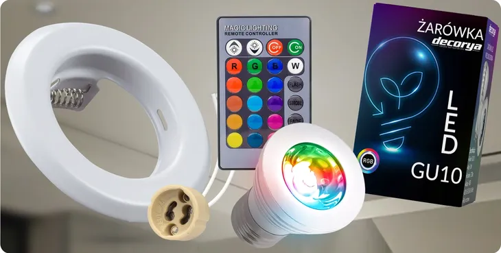 W zestawie z oprakwą otrzymujesz 9x żarówkę RGB oraz 9x gniazdo GU10.