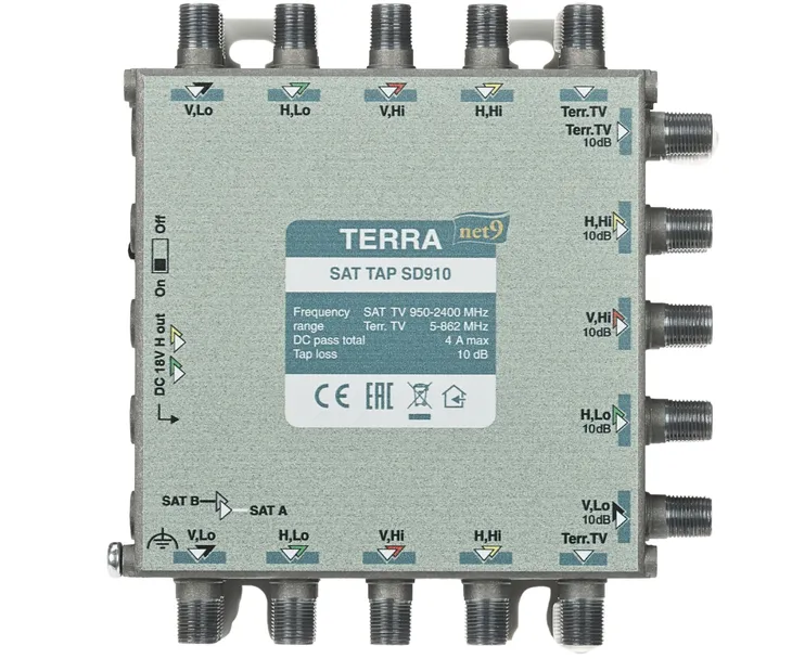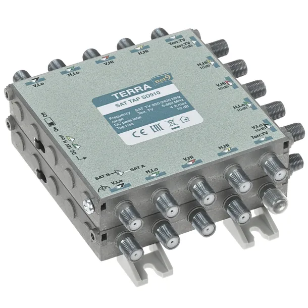 TERRA SD-910 to odgałęźnik RTV/SAT do instalacji multiswitchowych, służący do wydzielenia sygnału z magistrali na tor główny (przelot) oraz tor odgałęźny o większym tłumieniu. Urządzenie obsługuje 8 torów SAT + RTV naziemną (łącznie 9 wejść / 18 wyjść) i zastępuje 9 pojedynczych odgałęźników, ułatwiając wyrównanie poziomów sygnału w różnych częściach instalacji. Tłumienie w torze odgałęźnym wynosi 10 dB (RTV) oraz 8 ... 12 dB (SAT), a przełącznik umożliwia sterowanie przejściem DC. Odlewana obudowa zapewnia ekranowanie w klasie A. Rozgałęźnik posiada przełącznik przejścia stałoprądowego, który ustawiony w pozycję "ON" przepuszcza napięcie stałe przez tory "H" do obydwu gałęzi. Ustawiony w pozycje "OFF" przepuszcza napięcie tylko do jednej gałęzi.