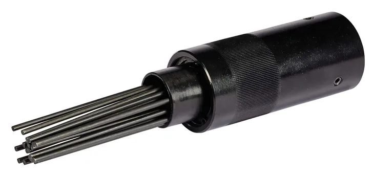 Montaż – nasadka do usuwania rdzy z wytrzymałymi metalowymi igłami może zostać przykręcona do cylindra młotka pneumatycznego.