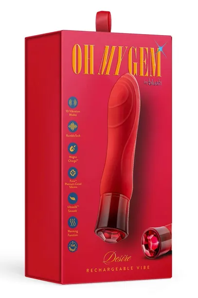 Ruby stands for an increase in love and sexual passionYou’re filled with desire and want to attract more pleasure to your life and routineDesire knows your need to lead the way to your own satisfaction and is here to assistThe unique end is perfect for delivering varying sensations during playIt’s time to succumb to desire! Warms to up to a very comfortable 416 degrees Celcisus (107 degrees Fahrenheit) for increased blood flow and enhanced pleasureMade from our pure platinum-cured Puria® silicone and enveloped with our satin smooth UltraSilk® this fierce vibrator offers a smooth and comfortable experience for all usersWater based, hybrid lube compatibleOh My Gems are hypoallergenic and body safe!10 Modes Rumble Tech™ powered deep rumbly vibrationsWarming function for a realistic feel which enhances comfort and pleasureExperience a tapered design with textured waves for added pleasureShaped for G spot pleasureCrafted From Puria® SiliconeEnveloped in satin smooth Ultrasilk®Fully submersible IPX7 waterproofMagna Charge® rechargeableEarth friendly cord45 Minutes of playLength 55 inch / 14 cmInsertable length 425 inch / 10,8 cmWidth 125 inch / 3,2 cm