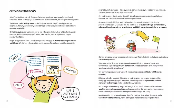 Nowa seria do zabawy i czytania dla dzieci w wieku przedszkolnym. „Aktywne czytanie PLUS”, czyli czytanie i działanie! Trzeba coś policzyć, wytężyć wzrok, poszukać słów, a nawet pomachać książką nad głową. Właśnie takie aktywne czytanie spowoduje, że mali czytelnicy nie tylko poznają przygodę, lecz także biorą w niej aktywny udział. Poza zabawami dzieci, które próbują już czytać samodzielnie, znajdą komiksowe dymki na każdej stronie – wyraźna czcionka i mało tekstu – idealnie, by od nich zacząć! Kto wie, może potem dzieci będą chciały przeczytać same całą książkę? W tej części razem z kotem Czarusiem dowiemy się, czym są ważne rzeczy i gdzie ich szukać. O autorce: Nazywam się Anna Jankowska. Jestem pedagożką, trenerką szkoleń, autorką książek i mamą. Na co dzień łączę pasję do literatury dziecięcej z wychowaniem wspierającym, dzieląc się pomysłami i przemyśleniami na blogu . Wierzę, że odpowiednio dobrane książki mogą pomóc dzieciom lepiej zrozumieć siebie i otaczający świat. Nie siadam do czytania bez kubka dobrej kawy, a wolny czas poświęcam na hodowanie pomidorów. Każdy krzaczek jest inny i wymaga dużo troski… zupełnie jak dzieci!
