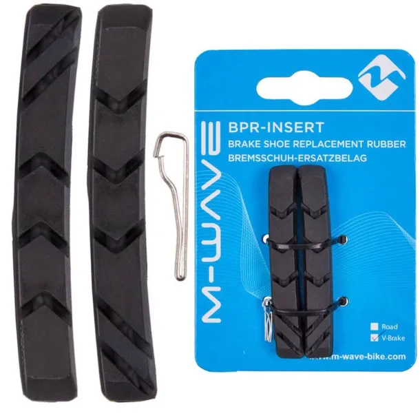 Okładziny do klocków M-WAVE BPR-Insert-VC 72mmWkłady klocków hamulcowych (gumki), przeznaczone do hamulców typu V-brake. Bardzo lekkie. Na każde warunki pogodoweAdvanced Compound: jest to wyjątkowa mieszanka, która zapewnia doskonałą wydajność na wszystkich obręczach wykonanych ze stopów aluminium oraz stali, zapewniając wspaniałe osiągi zarówno w suchych, jak i mokrych warunkach.W komplecie wraz z zawleczkami. Długość : 72 mm Waga : 10 g (para)