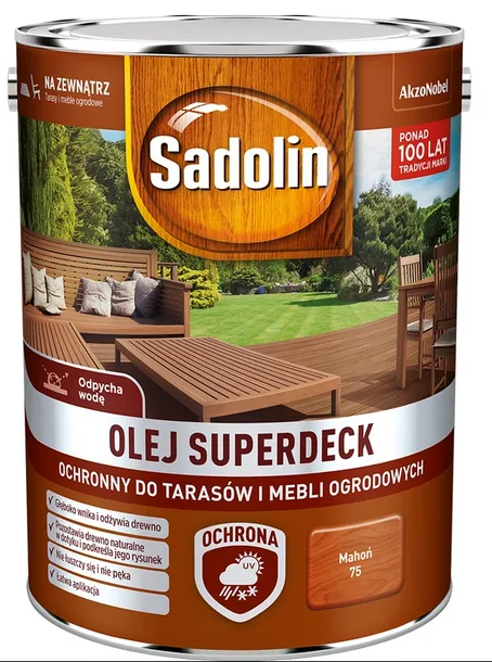 - Sadolin Olej Superdeck do mebli i tarasów to nowoczesny olej o dużej zawartości żywic przeznaczony do konserwacji i dekoracji tarasów drewnianych oraz mebli ogrodowych, a także innych powierzchni drewnianych na zewnątrz.